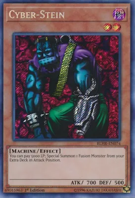 Cyber-Stein is a machine monster that was released as a prize card for the Shonen Jump Championship Series in 2004. It has an effect that allows it to pay 5000 life points and special summon one fusion monster from its extra deck in attack position. It can be used to summon powerful fusion monsters like Blue-Eyes Ultimate Dragon or Cyber End Dragon and finish off the opponent with one attack.